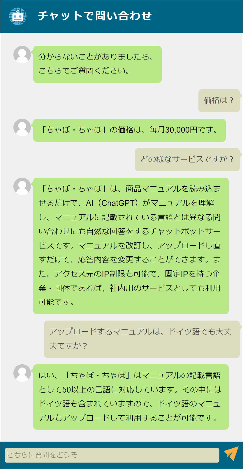「ちゃぼ・ちゃぼ」に事前に読み込ませる商品マニュアルは、日本語に限定されません。ChatGPTが対応する50以上の言語に対応します。例えば、英語のマニュアルで学習した情報を元に、日本語の質問には日本語で回答します。