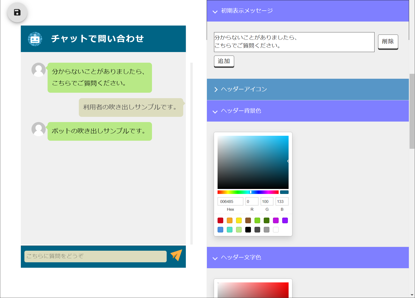 サンプルを確認しながら、商品イメージに沿ったロゴ、タイトル、初期メッセージ、配色等を設定します。